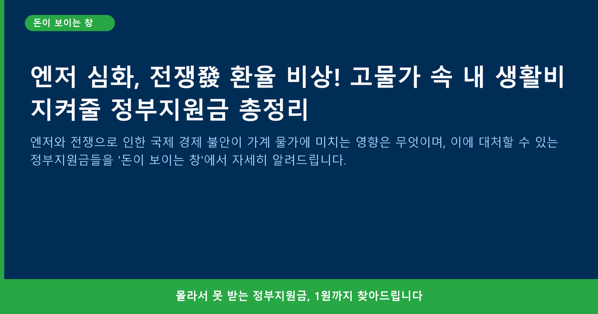 최근 국제 정세 불안과 중동 전쟁의 장기화로 인해 엔저 현상이 심화되고 달러 대비 원화 환율 또한 요동치고 있습니다. 1년 8개월 만에 달러당 160엔을 돌파했다는 소식은 단순한 뉴스 속 이야기가 아니라, 바로 우리 집 장바구니 물가와 생활비에 직접적인 영향을 미치고 있습니다. 급격한 환율 변동은 수입 물가를 끌어올려 물가상승을 가속화하고, 이는 결국 서민들의 생활비 부담으로 이어지죠. 하지만 걱정하지 마세요. 이런 위기 상황 속에서도 우리 가계의 든든한 버팀목이 되어줄 다양한 정부지원금들이 있습니다. ‘돈이 보이는 창’에서 엔저와 고물가 시대에 현명하게 대처하고 내 돈을 지킬 수 있는 방법을 함께 알아보겠습니다.
